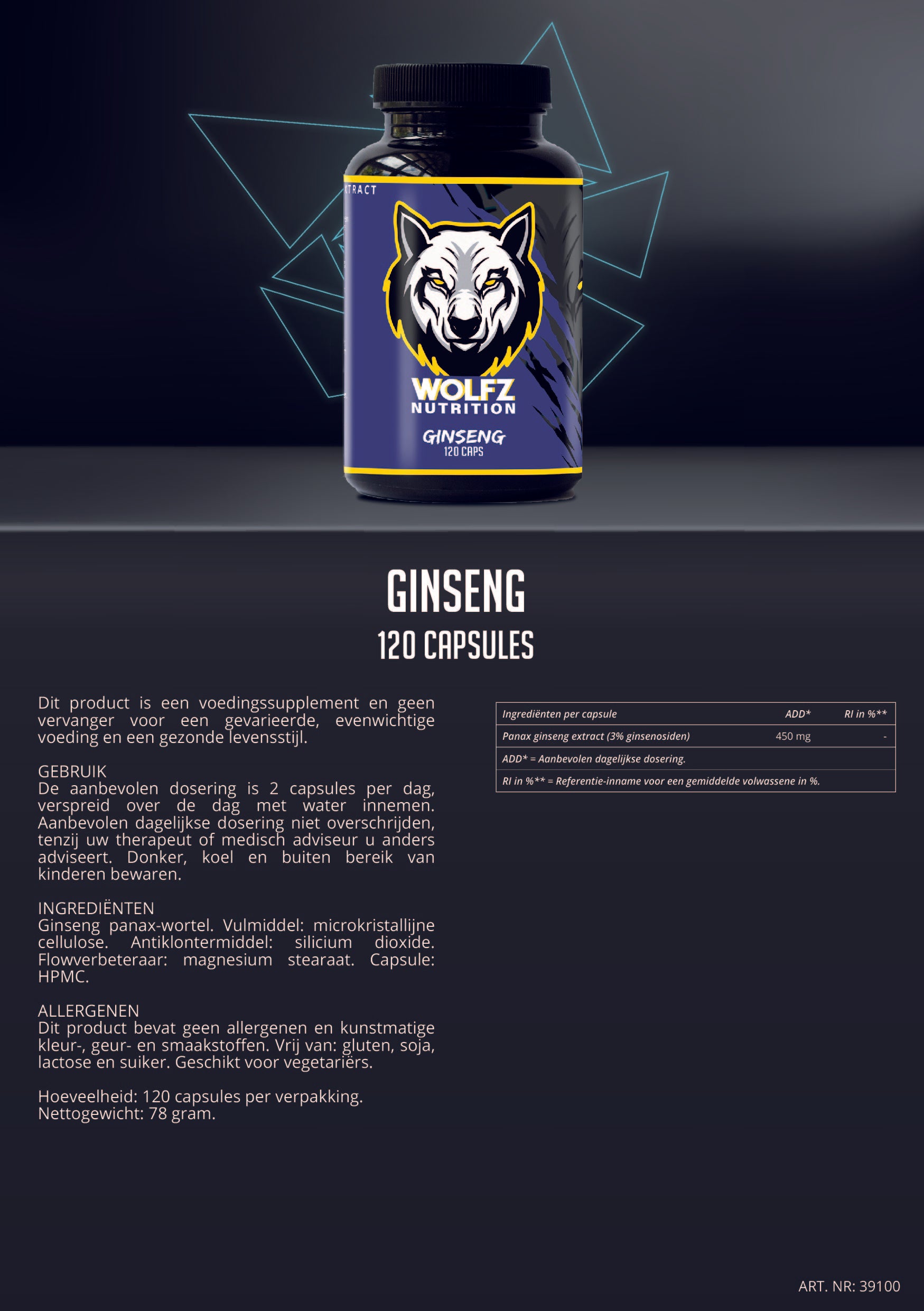 INGREDIËNTEN Ginseng panax-wortel. Vulmiddel: microkristallijne cellulose. Antiklontermiddel: silicium dioxide. Flowverbeteraar: magnesium stearaat. Capsule: HPMC.