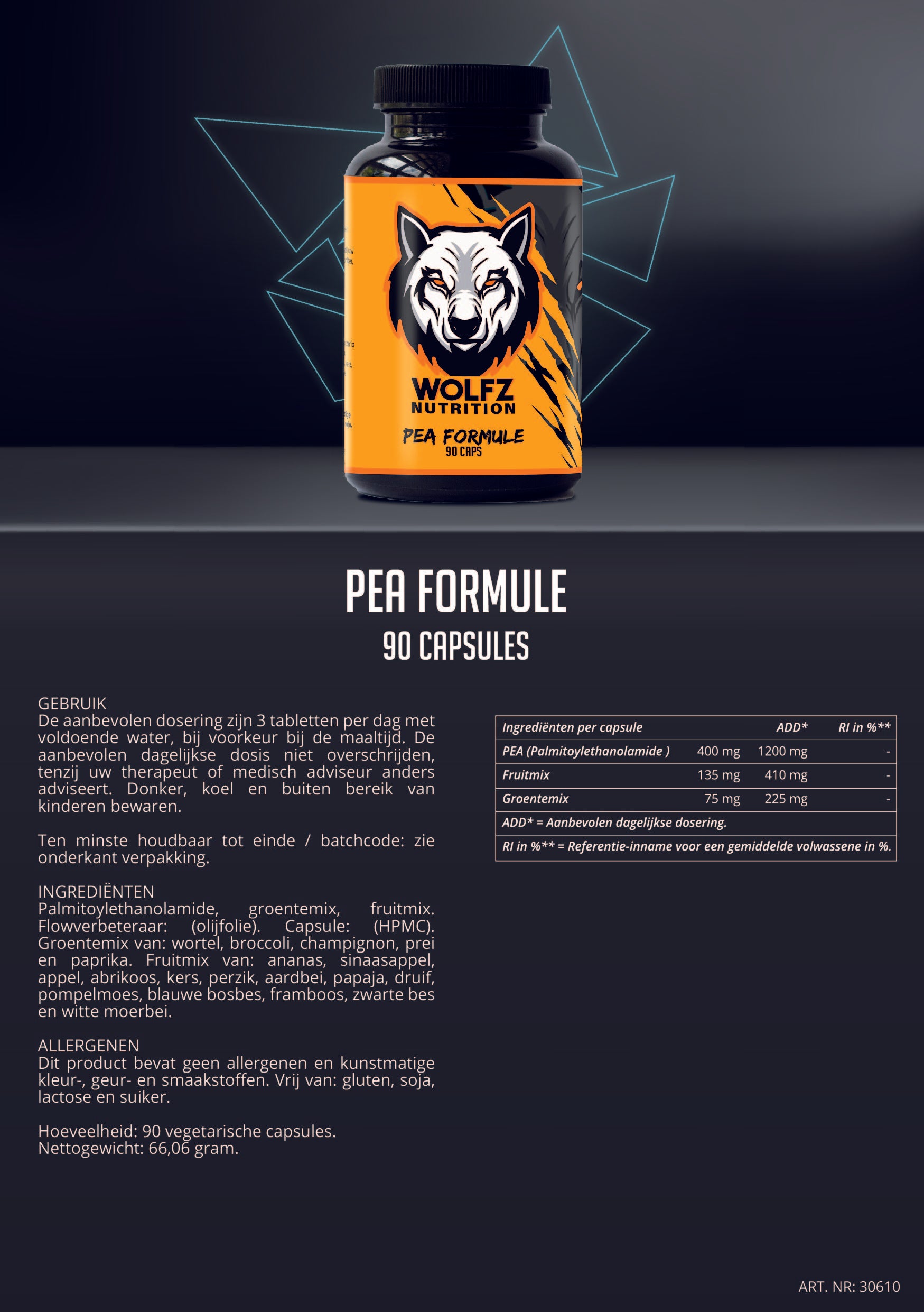 INGREDIËNTEN Palmitoylethanolamide, groentemix, fruitmix. Flowverbeteraar: (olijfolie). Capsule: (HPMC). Groentemix van: wortel, broccoli, champignon, prei en paprika. Fruitmix van: ananas, sinaasappel, appel, abrikoos, kers, perzik, aardbei, papaja, druif, pompelmoes, blauwe bosbes, framboos, zwarte bes en witte moerbei.