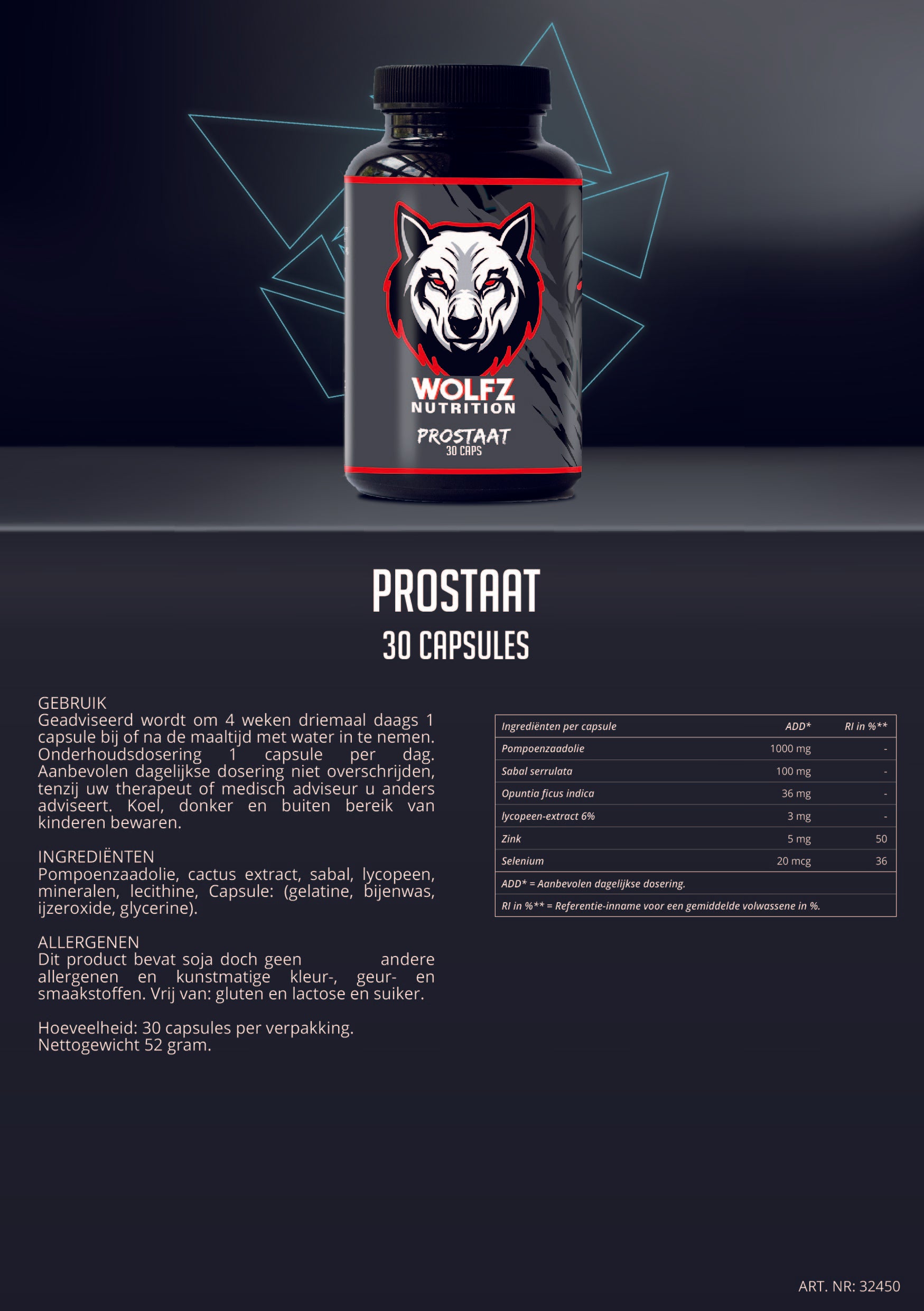 INGREDIËNTEN Pompoenzaadolie, cactus extract, sabal, lycopeen, mineralen, lecithine, Capsule: (gelatine, bijenwas, ijzeroxide, glycerine).