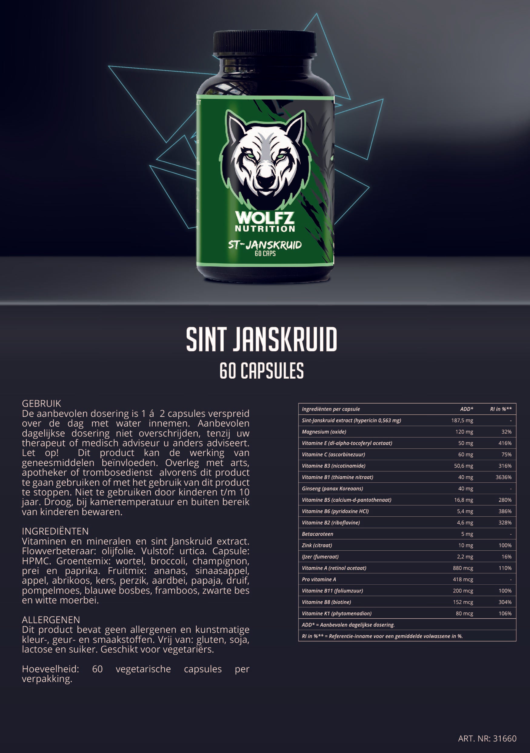 INGREDIËNTEN Vitaminen en mineralen en sint Janskruid extract. Flowverbeteraar: olijfolie. Vulstof: urtica. Capsule: HPMC. Groentemix: wortel, broccoli, champignon, prei en paprika. Fruitmix: ananas, sinaasappel, appel, abrikoos, kers, perzik, aardbei, papaja, druif, pompelmoes, blauwe bosbes, framboos, zwarte bes en witte moerbei.