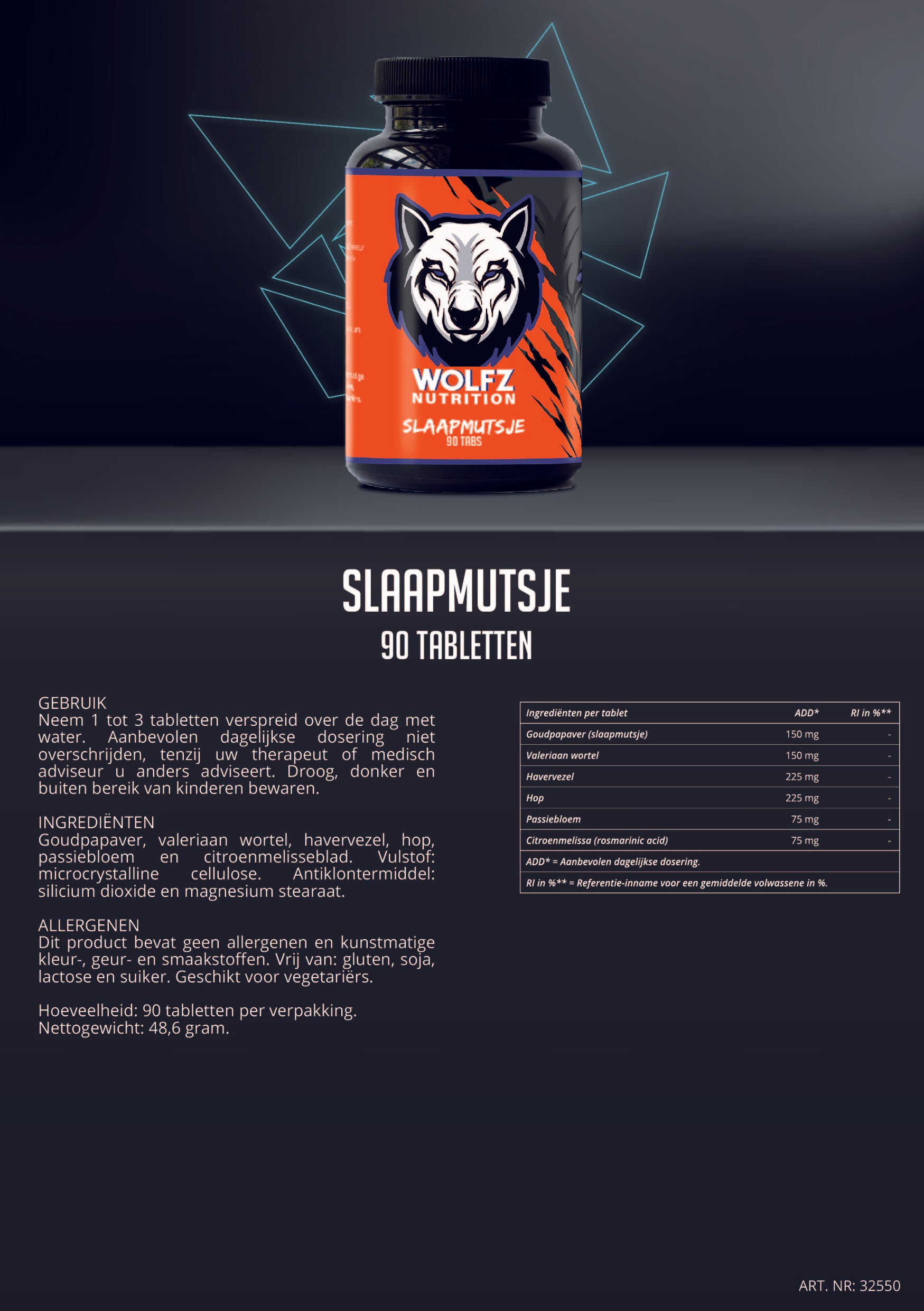 Hoeveelheid: 90 tabletten per verpakking. Nettogewicht: 48,6 gram.